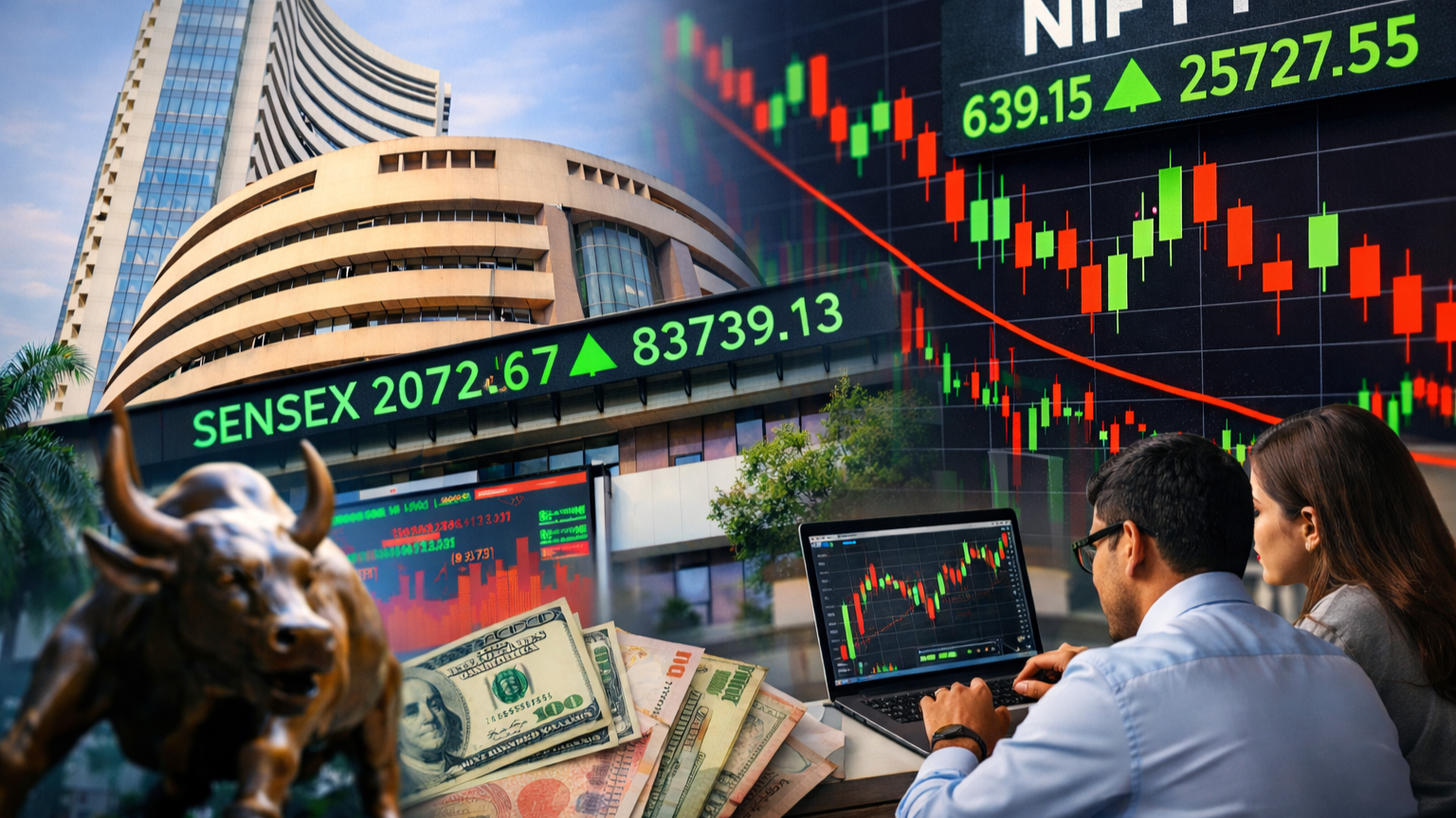 On the previous trading session, the Indian stock market closed with strong gains across both benchmark indices. The BSE Sensex jumped 2,072.67 points, registering a sharp rise of 2.54 percent to settle at 83,739.13. Meanwhile, the NSE Nifty also moved higher, climbing 639.15 points or 2.55 percent to close at 25,727.55. This broad-based rally reflected strong investor confidence, supported by positive global cues, foreign institutional buying, and improving market sentiment.